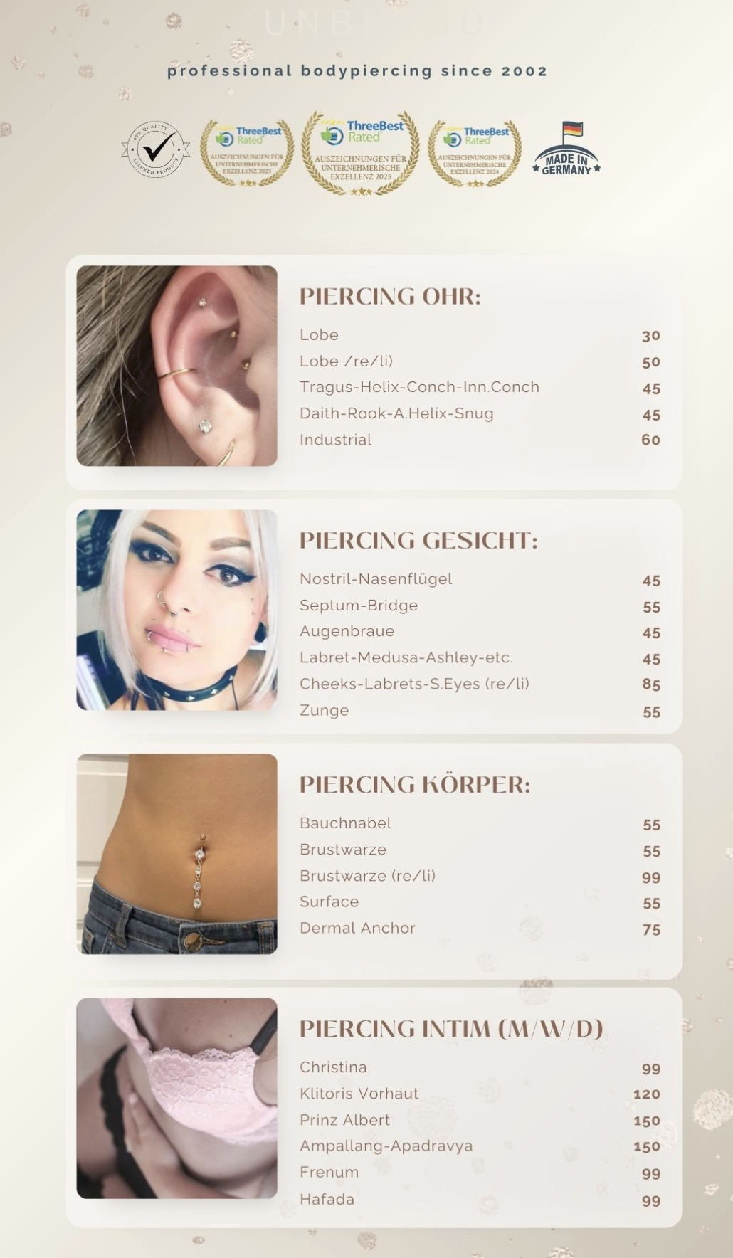 erstklassige Piercings, von Lobe über Septum bis hin zu Intimem Schmuck.